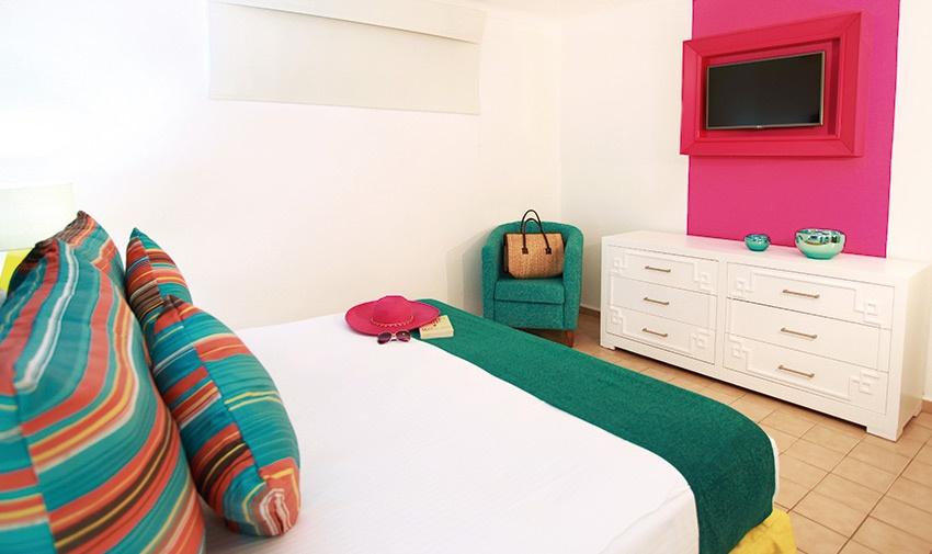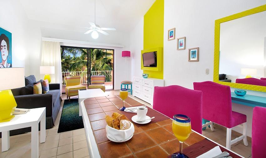 Enjoy our Junior Suite at Five-Star All-Inclusive Beach Resort & Spa Puerto Vallarta, which features fresh colors and rich materials designed to help you relax and revel in the bliss of being on a Puerto Vallarta all-inclusive vacation. Your choice of one king-sized bed or two double beds makes this the perfect option for a couple’s retreat or a small family getaway. The spacious bathroom with travertine marble décor and the fully equipped kitchenette allows for the greatest convenience and comfort. There is also a dining area for 2 and a balcony with an ocean or garden view equipped with patio furniture.